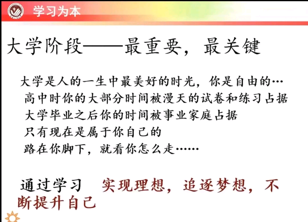 大学是知识的海洋,是梦想和实现梦想的地方。希望大家做到:自觉、自省、自律、自强,充实自己,不断提升自己,才能实现梦想。