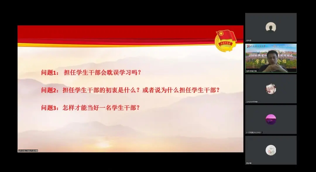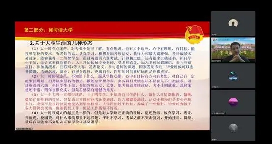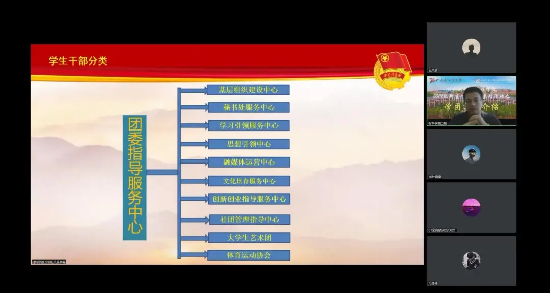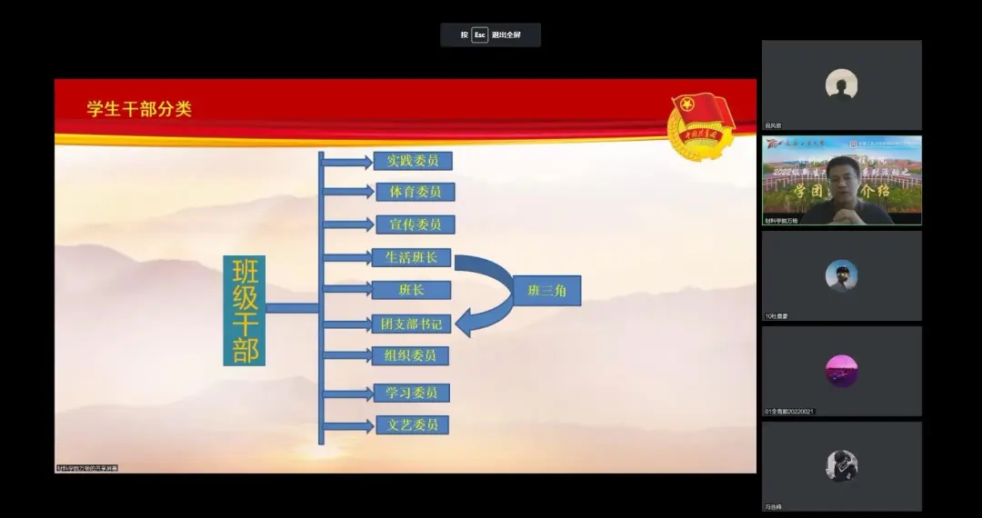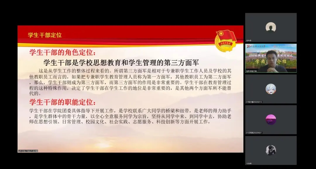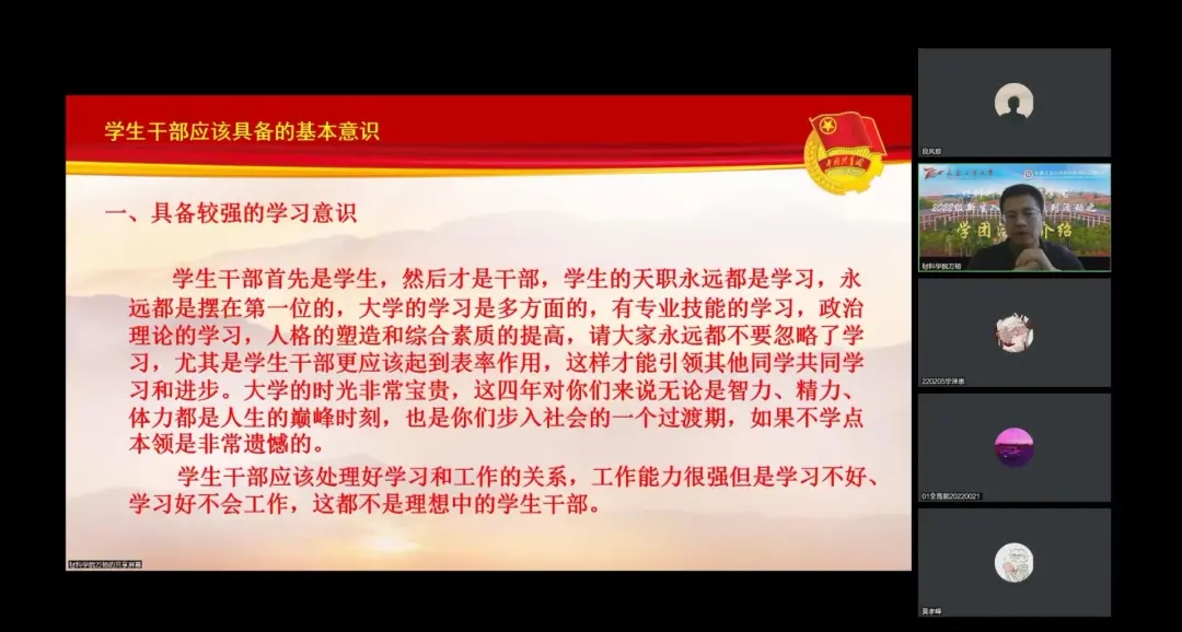 于线上开展2022级新生入学教育系列活动之学团活动专题培训会。本次培训会由学院团委书记万杨主讲,培训内容主要从学院学生干部的职能定位、管理机制、相关岗位需求以及学生干部所需的基本意识展开。2022级全体新生参加此次培训会。