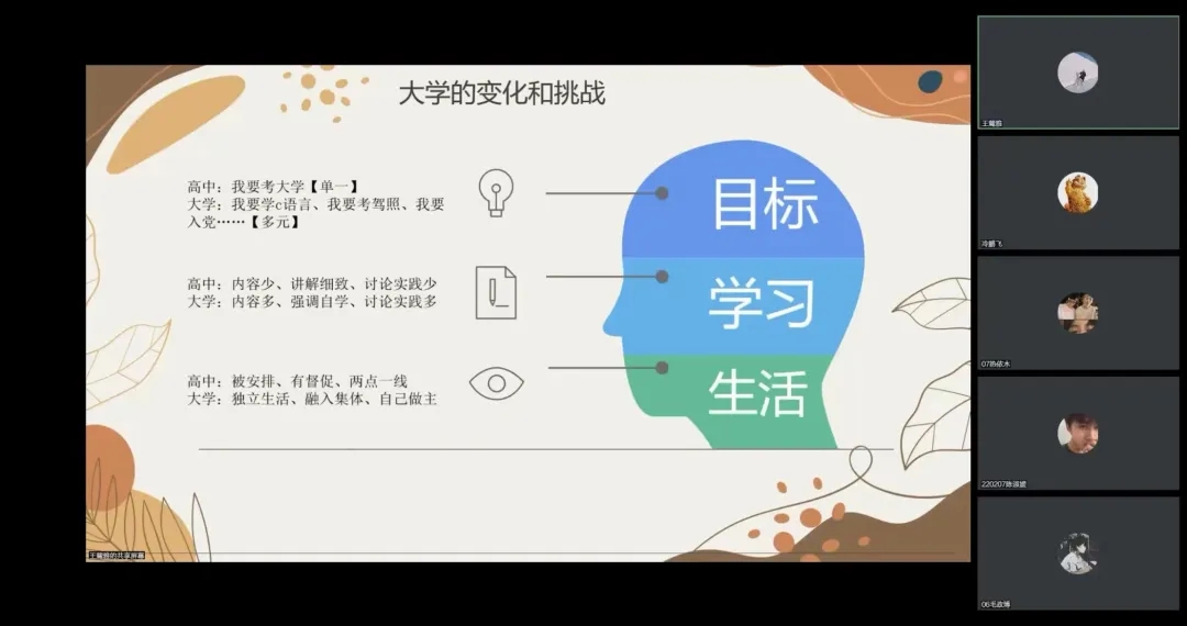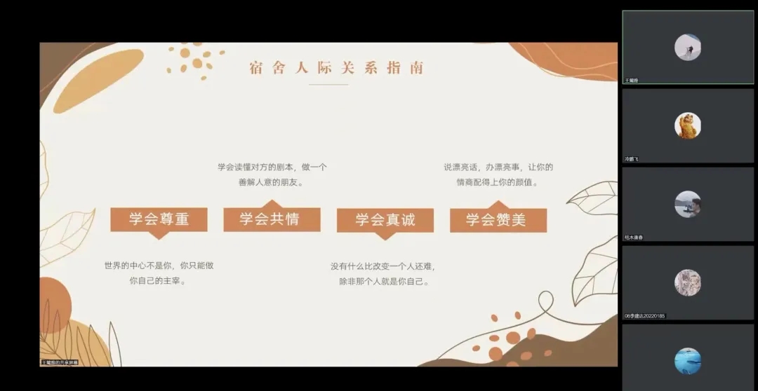王麓雅老师从四个方面分别讲述了同学们在大学期间可能产生的心理健康问题,并帮助同学们找到适合自己的解决办法。