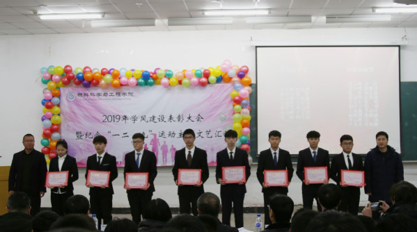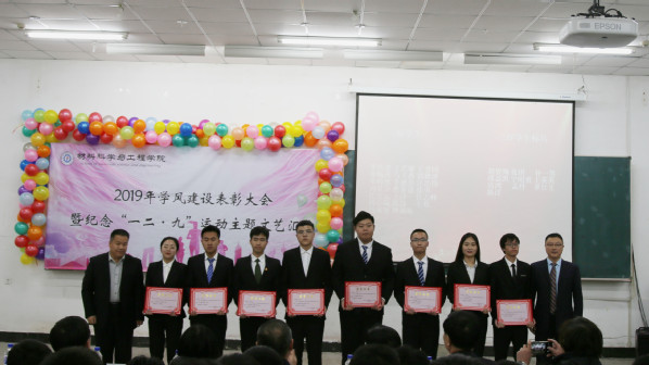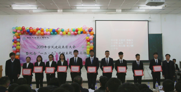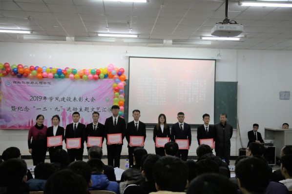 在北湖校区西阶102教室举办学风建设表彰大会暨纪念“一二·九”运动主题文艺汇演。应邀出席本次大会的领导及嘉宾有:校党委副书记孟雷、校党委副书记李雁冰、校教务处处长李万龙、校学生工作部部长周文军、校团委书记仲崇利、校党委宣传部副部长邹绍岩、学院党委书记兰民、院长冉旭 、党委副书记吴文东、副院长刘耀东、副院长赵占奎、副院长韩英、金属材料工程系主任陈华、材料成型及控制工程系主任赵宇、学院全体辅导员及辅导员助理、教师代表、受表彰学生代表及各年级学生代表。本次大会由91大赛