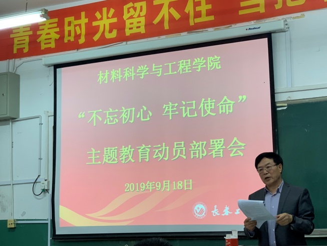 学院党委书记兰民做了“不忘初心 牢记使命”主题教育动员讲话。他从开展本次主题教育的重要意义、历史背景、目标任务等方面强调了开展“不忘初心 牢记使命”主题教育的重要性,要求全体党员要高标准完成这次主题教育,要求所有人要将其作为一项重大政治任务抓紧抓实抓出成效,要紧密结合学院发展建设实际,围绕学院党建工作发展不平衡、党建与业务工作融合不够、支部活力不足,教学质量提升、学科建设、干部干事创业动力不够等方面深入开展专项整治,要确保在主题教育结束时见成果、见实效。