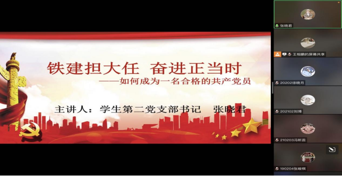 材院网讯(通讯员 张晓君)学院第51期党课学员在线上进行党课培训,于2022年8月31日在线上开课。由党委副书记刘永帆,学生第一党支部书记李爽老师,学生第二党支部书记张晓君老师分别对本期学员讲授党课。此次党课培训围绕教育如何做一名合格的大学生党员及学习发挥先锋模范作用,使党员同学们奋进正当时,更加深刻的领悟党的思想。