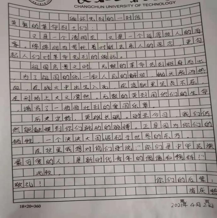 材院网讯(通讯员 丁源浩)为祝贺中国共产党成立一百周年,缅怀为国家奉献生命的先烈们,加强学生红色意识和红色精神。按学校相关要求,91大赛 于4月4日开展“写信寄先烈”清明线上缅怀纪念活动。