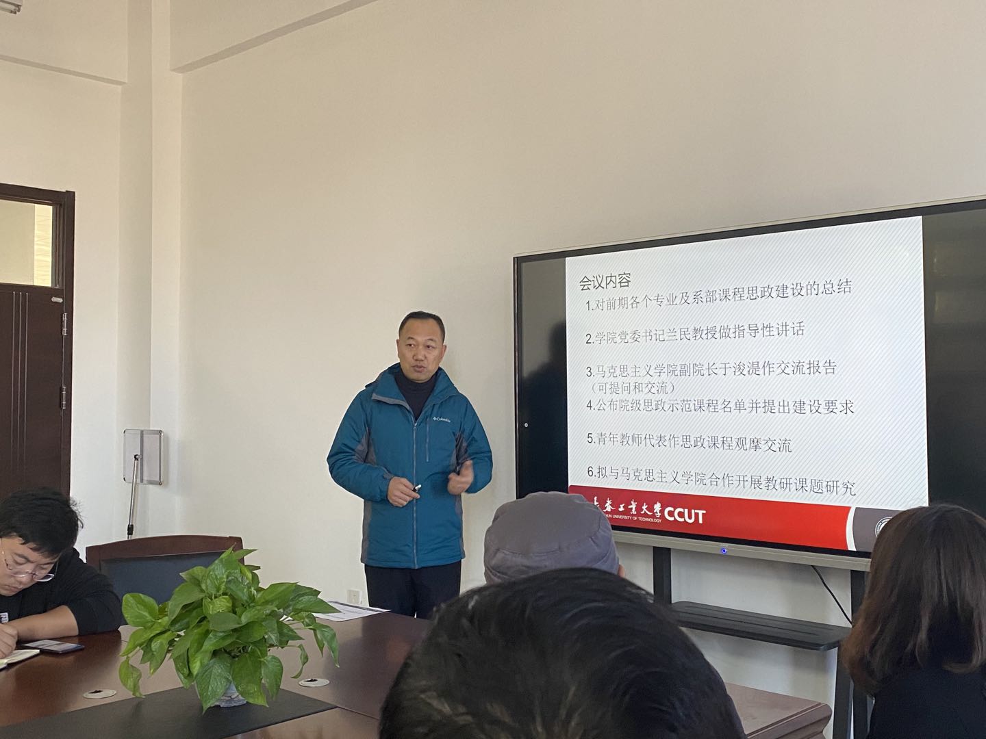 结对单位马克思主义学院副院长于浚湜就深入挖掘专业课程中的思想引领和对国家政策的宏观把握做了交流报告。