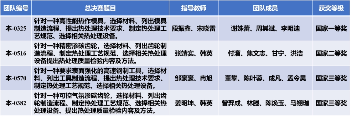 自2025年4月,学院启动材料热处理创新创业赛校内选拔活动,吸引60余名学子报名参赛。经过师生共同精心准备及多轮模拟演练,推荐4支代表队参加东北区域赛,获区域赛一等奖3项,二等奖1项,全部进入全国总决赛。经激烈角逐,4只代表队分别斩获国赛一等奖1项、二等奖1项、三等奖2项。