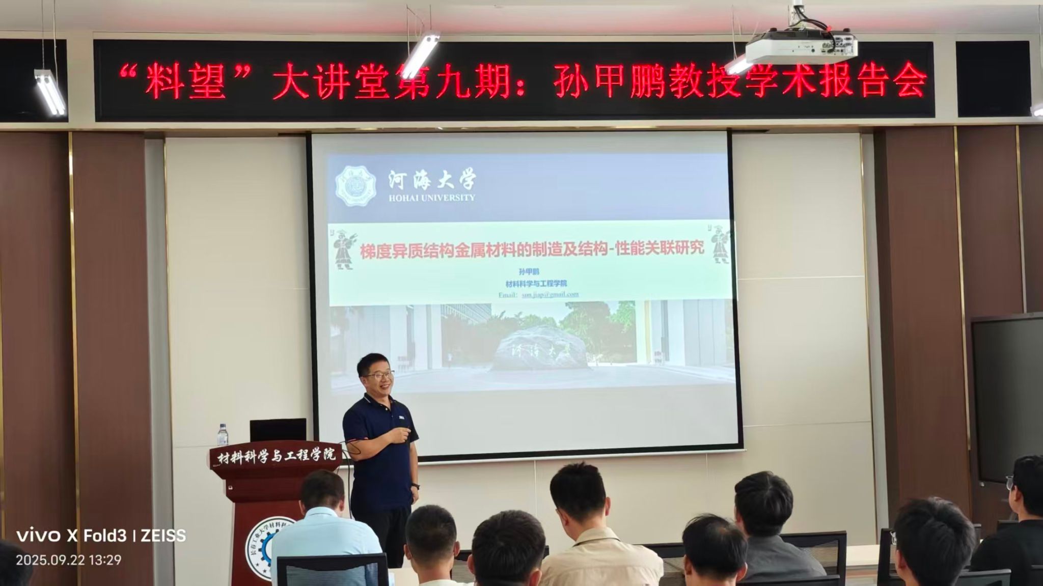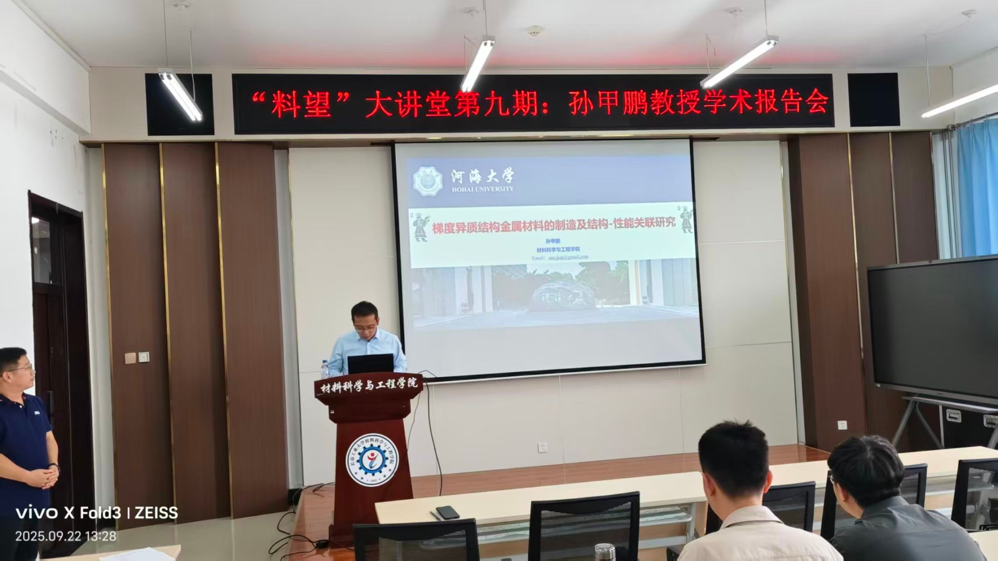 “料望”大讲堂系列学术报告第九期在材料楼417会议室举行。特邀河海大学大禹学者、硕士生导师孙甲鹏作专题报告。报告会由朱巍巍副院长主持,学院领导、青年教师、研究生参加了报告会。